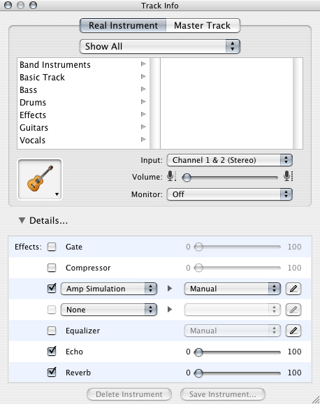 - In the bottom half of the Track Info window, select one of the Effects pop-up menus in the left column. In the image above, the pop-up menus "Amp Simulation" and "None" can be turned into different Audio Unit effects. Select the effect you want to change to a different Audio Unit effect; for example, click on "Amp Simulation":
